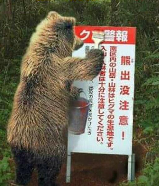 誰だよ~、こんなところに看板を立てたのは?、長年住んでるのに熊なんで見たこともないよ。